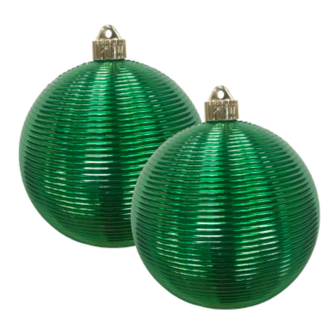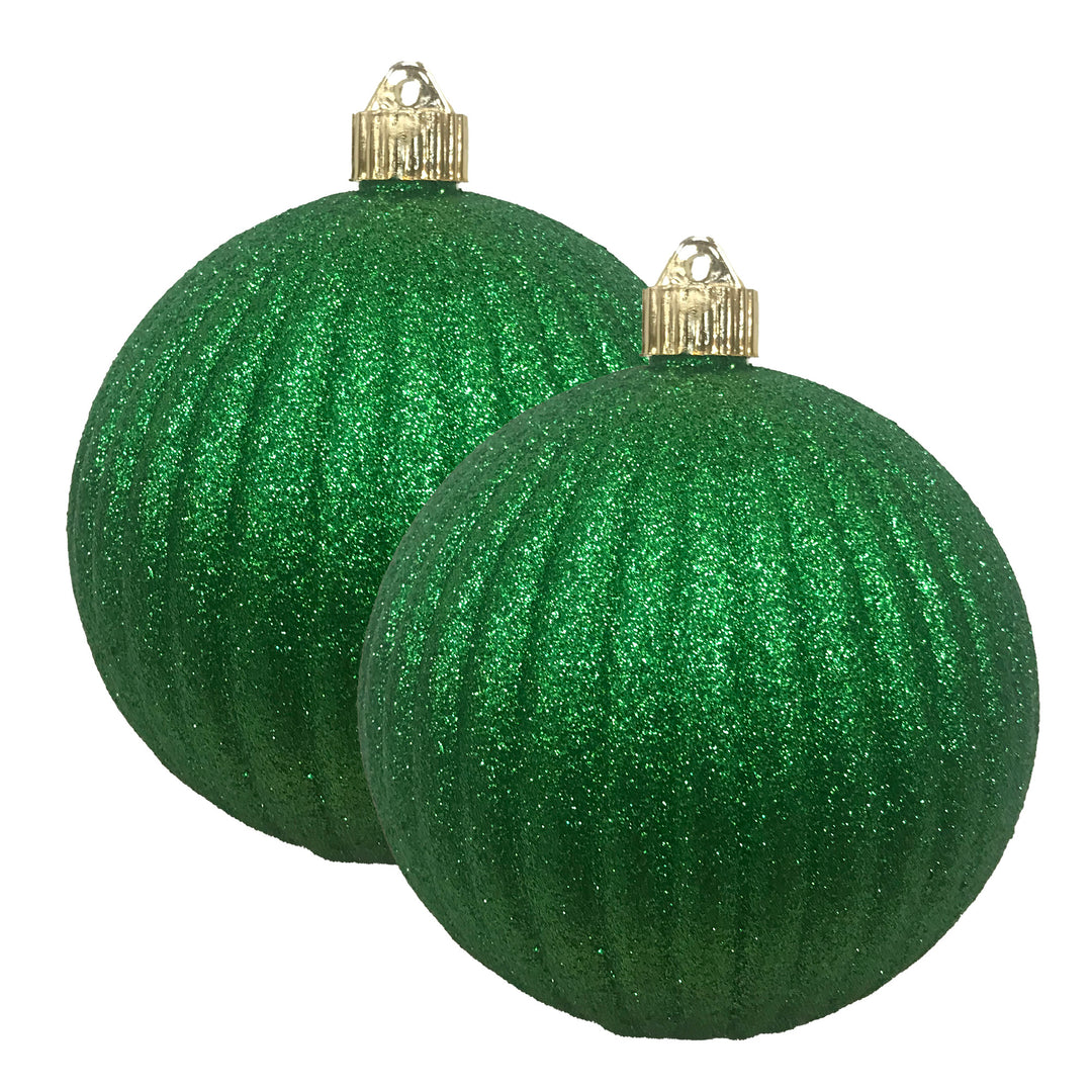 Christmas By Krebs 6" (150mm) Ribbed Green Glitter [2 Pieces] Solid Commercial Grade Indoor and Outdoor Shatterproof Plastic, Water Resistant Ball Ornament Decorations