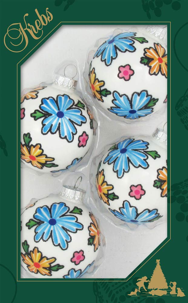 Glass Christmas Tree Ornaments - 67mm/2.63" [4 Pieces] Decorated Balls from Christmas by Krebs Seamless Hanging Holiday Decor (Porcelain White with Large Flower)
