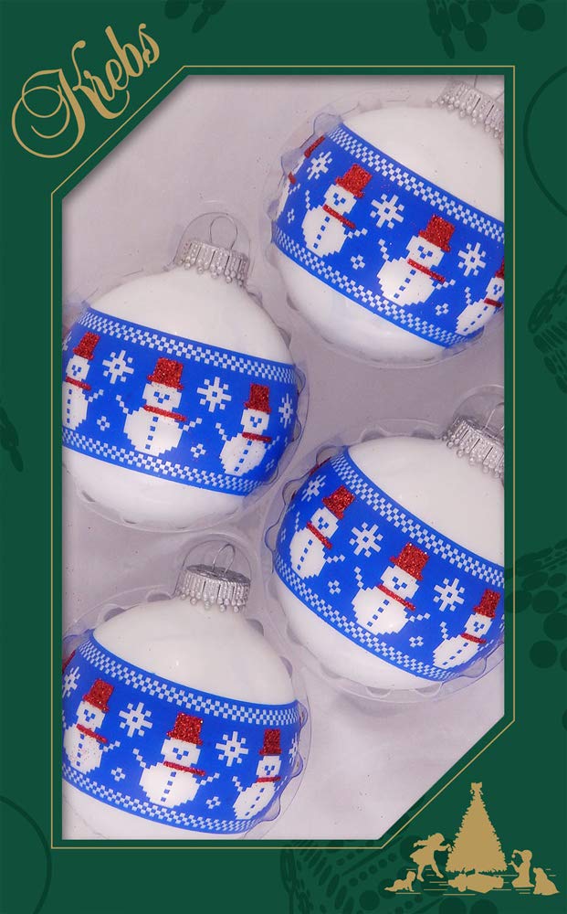 Glass Christmas Tree Ornaments - 67mm/2.63" [4 Pieces] Decorated Balls from Christmas by Krebs Seamless Hanging Holiday Decor (Porcelain White with Stiched Snowman Band)