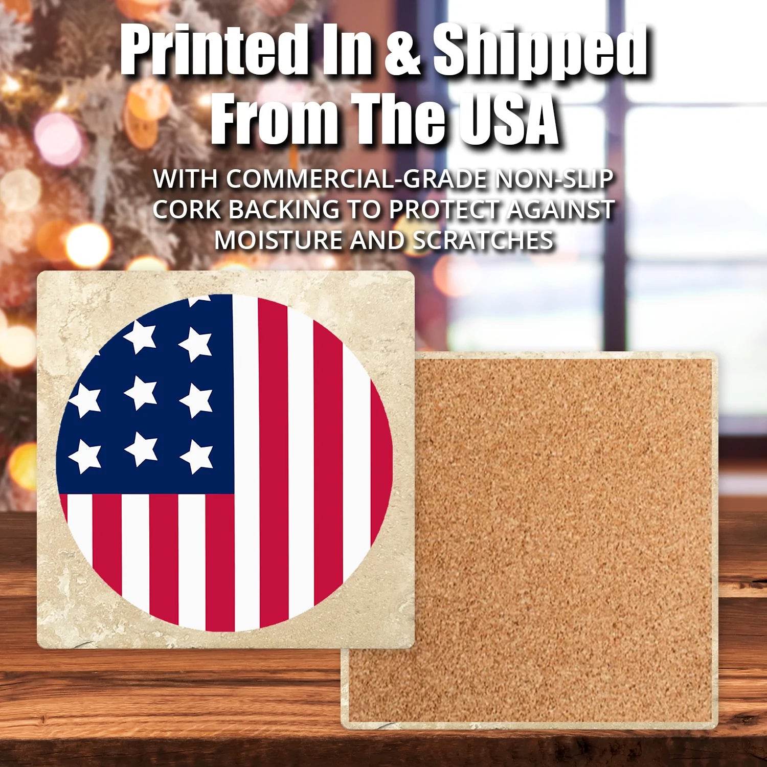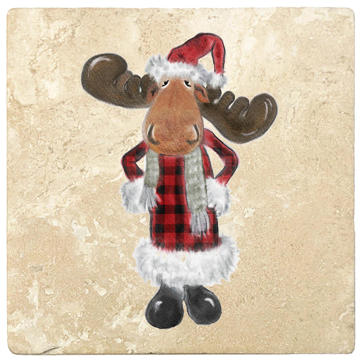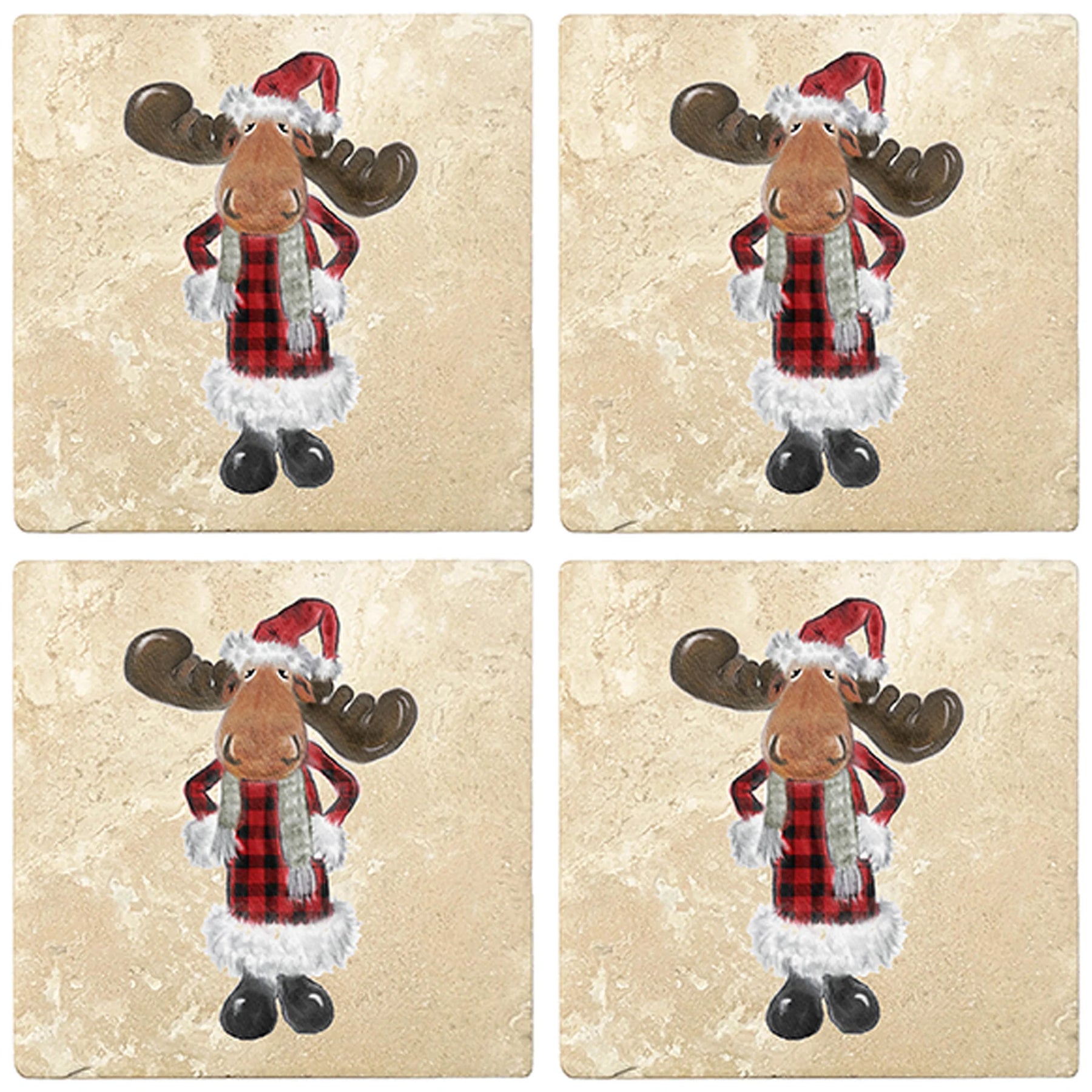 4" premium travertine absorbent stone coasters with cork backing - Moose in Santa Costume. 2 sets of 4 pieces, 8 pieces total. Made in Mexico. Printed in the USA.