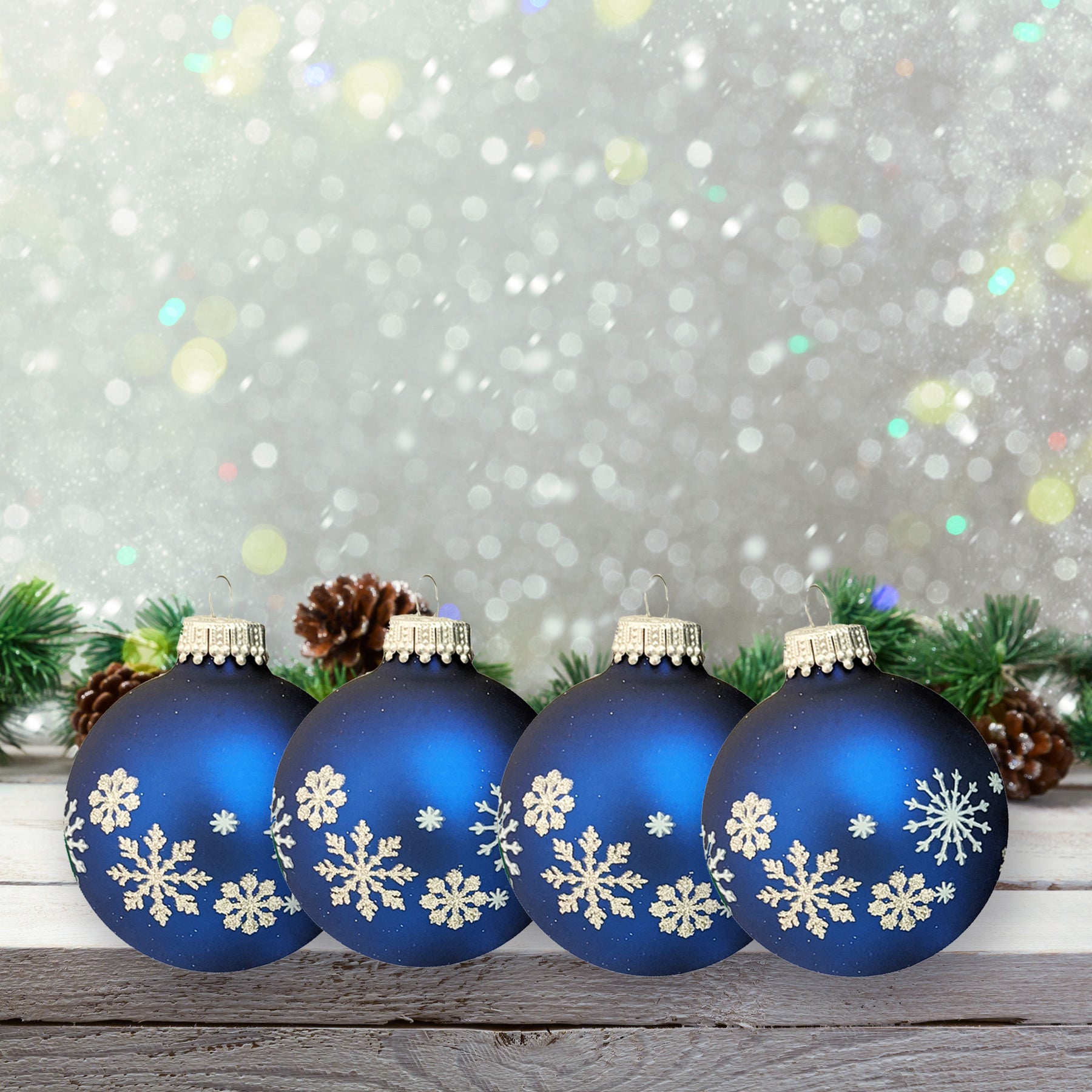 Glass Christmas Tree Ornaments - 67mm/2.63" [4 Pieces] Decorated Balls from Christmas by Krebs Seamless Hanging Holiday Decor (Blue w/ Silver Glitter and White Snowflakes)