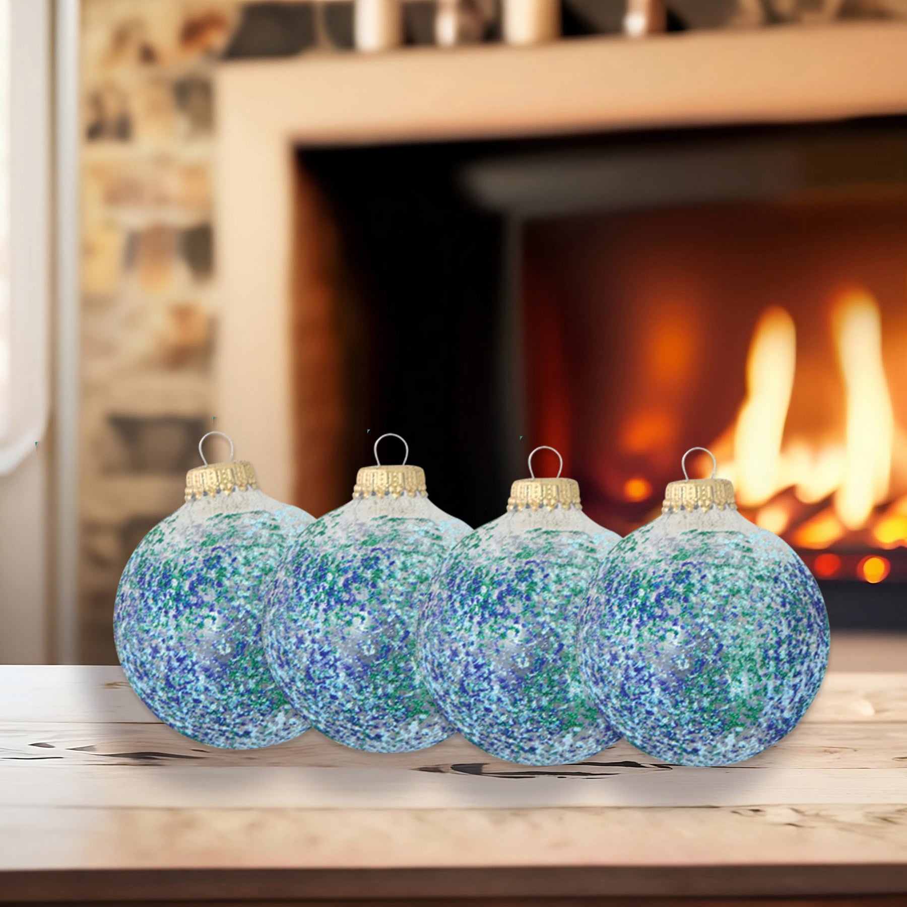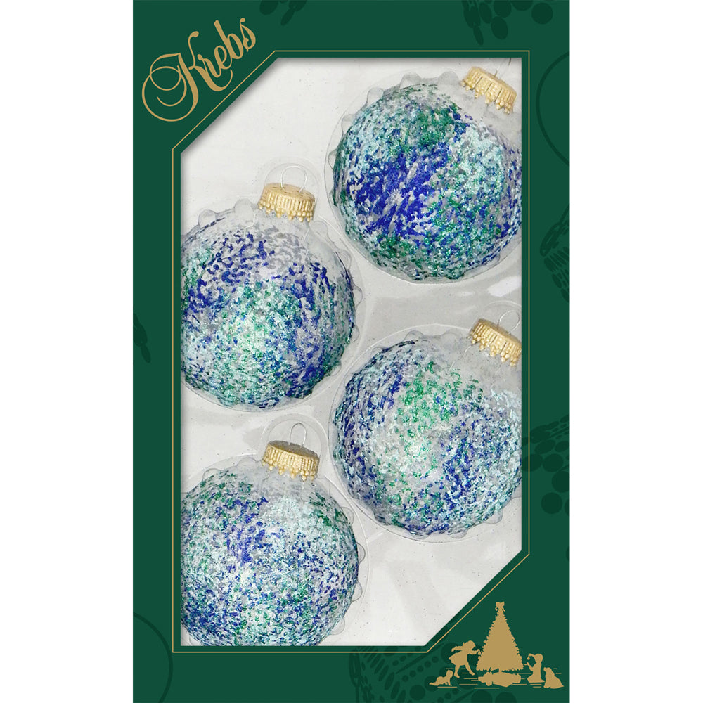 Glass Christmas Tree Ornaments - 67mm/2.63" [4 Pieces] Decorated Balls from Christmas by Krebs Seamless Hanging Holiday Decor (Clear with Blue Glitter Sponge Pattern)