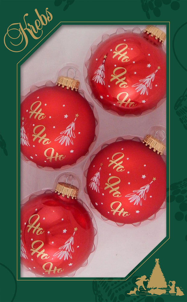 Glass Christmas Tree Ornaments - 67mm/2.63" [4 Pieces] Decorated Balls from Christmas by Krebs Seamless Hanging Holiday Decor (Candy Apple Red & Flame Red with Ho Ho Ho)