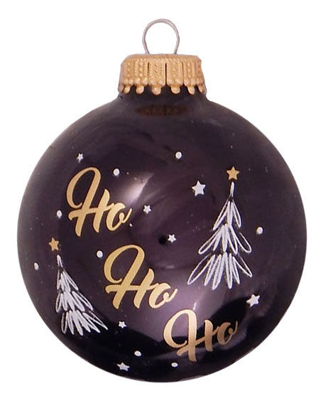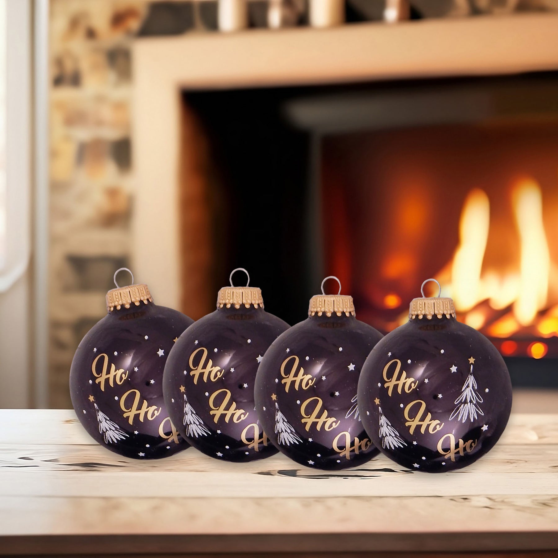 Glass Christmas Tree Ornaments - 67mm/2.625" [4 Pieces] Decorated Balls from Christmas by Krebs Seamless Hanging Holiday Decor (Ebony Shiny with Ho Ho Ho)