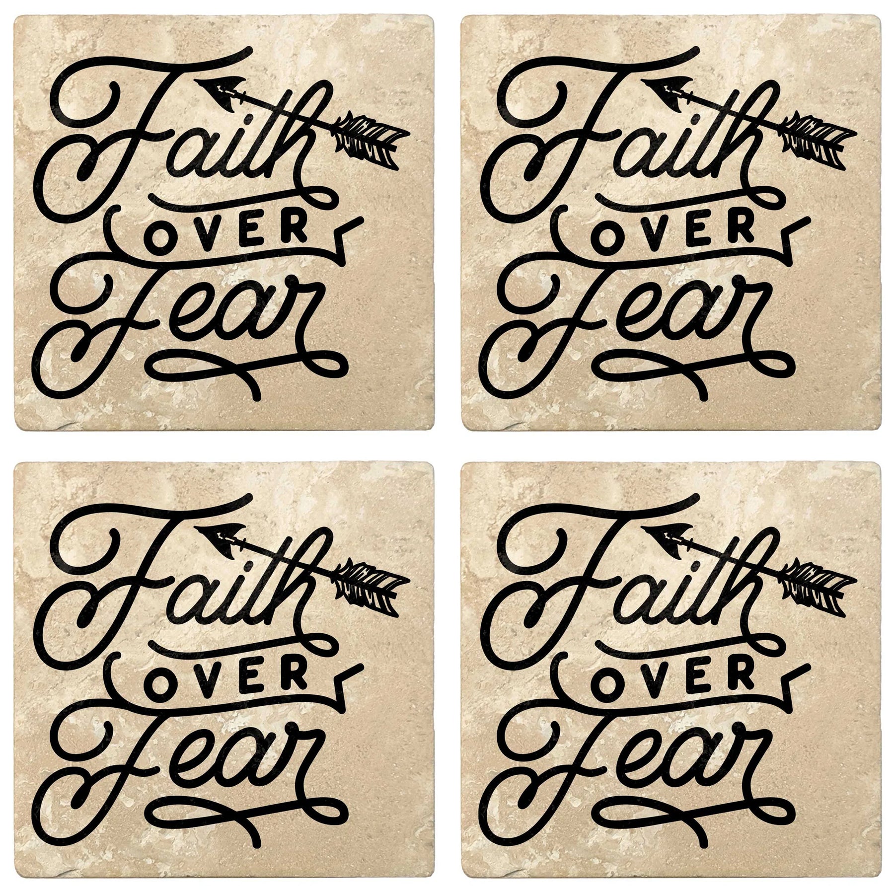 4" premium travertine absorbent stone religious drink coasters with cork backing, faith over fear. 2 sets of 4 pieces, 8 pieces total. Made in Mexico. Printed in the USA.