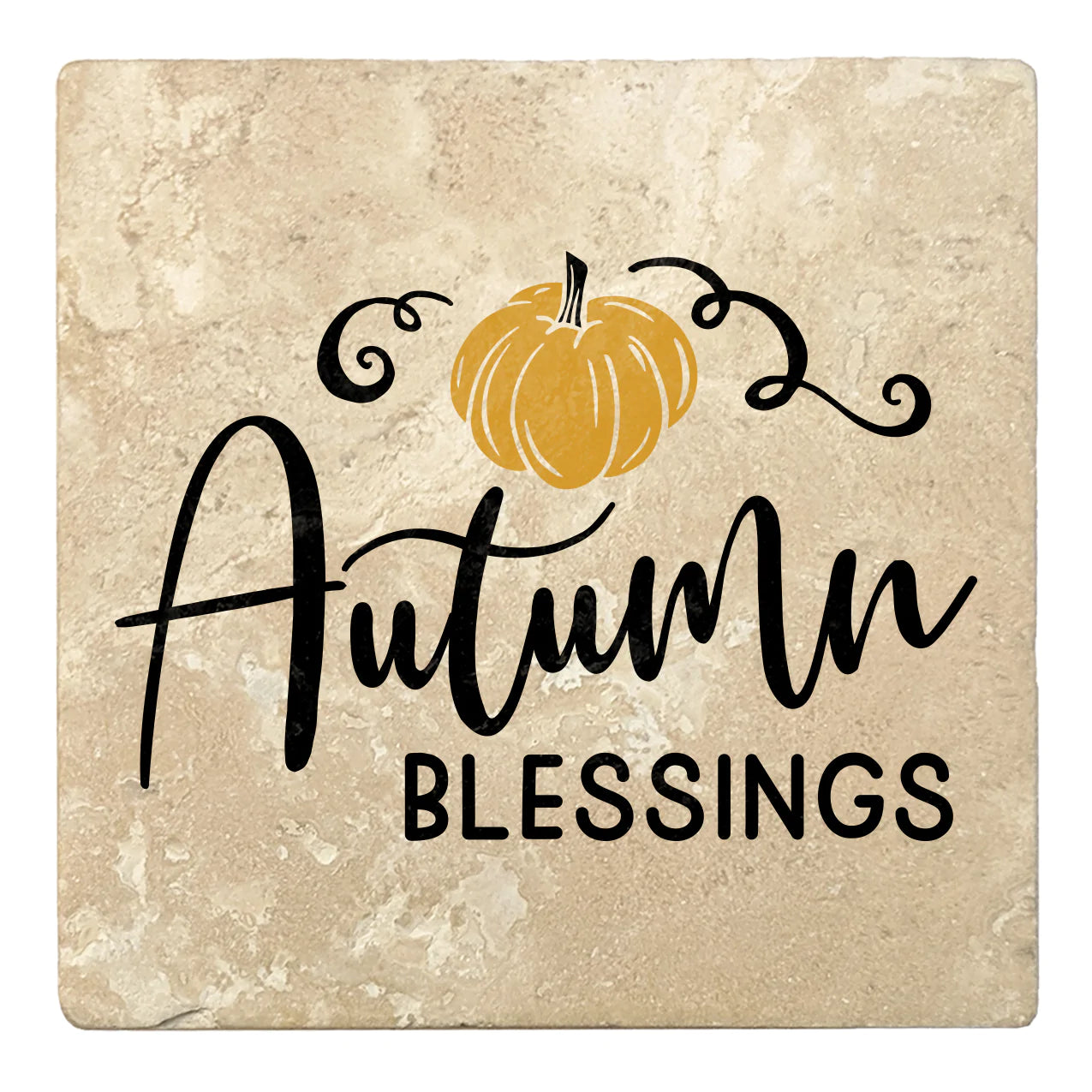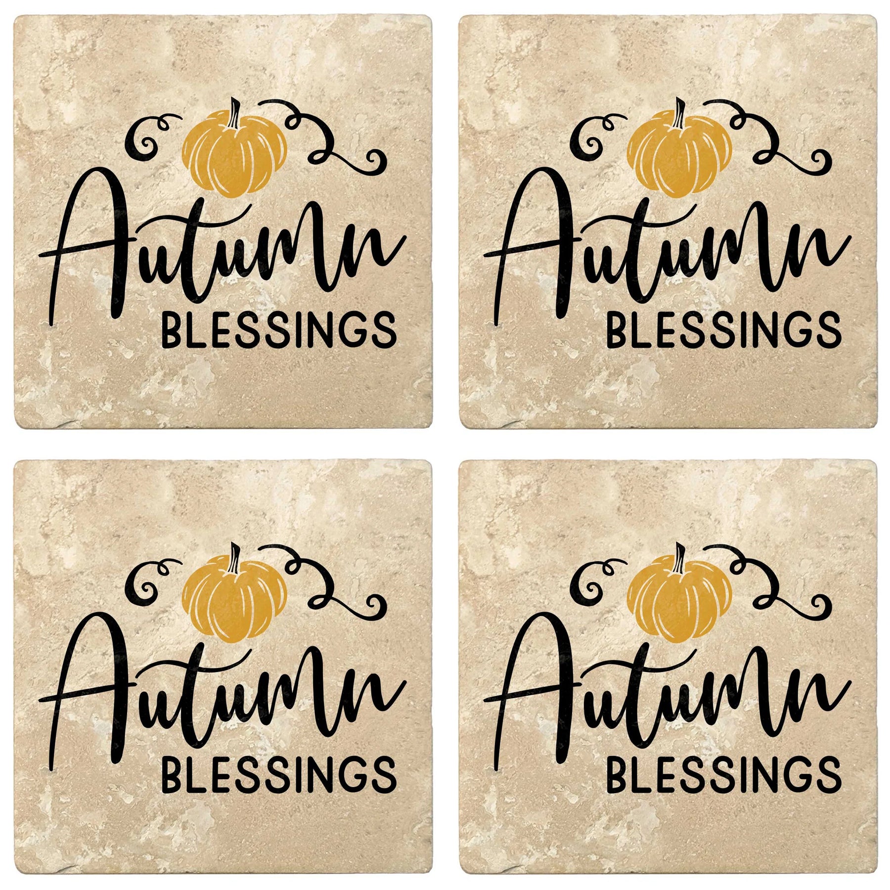4" premium travertine absorbent stone fall seasonal coasters with cork backing, autumn blessings. 2 sets of 4 pieces, 8 pieces total. Made in Mexico. Printed in the USA.
