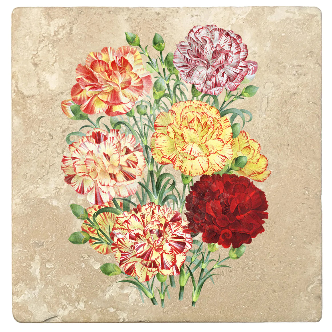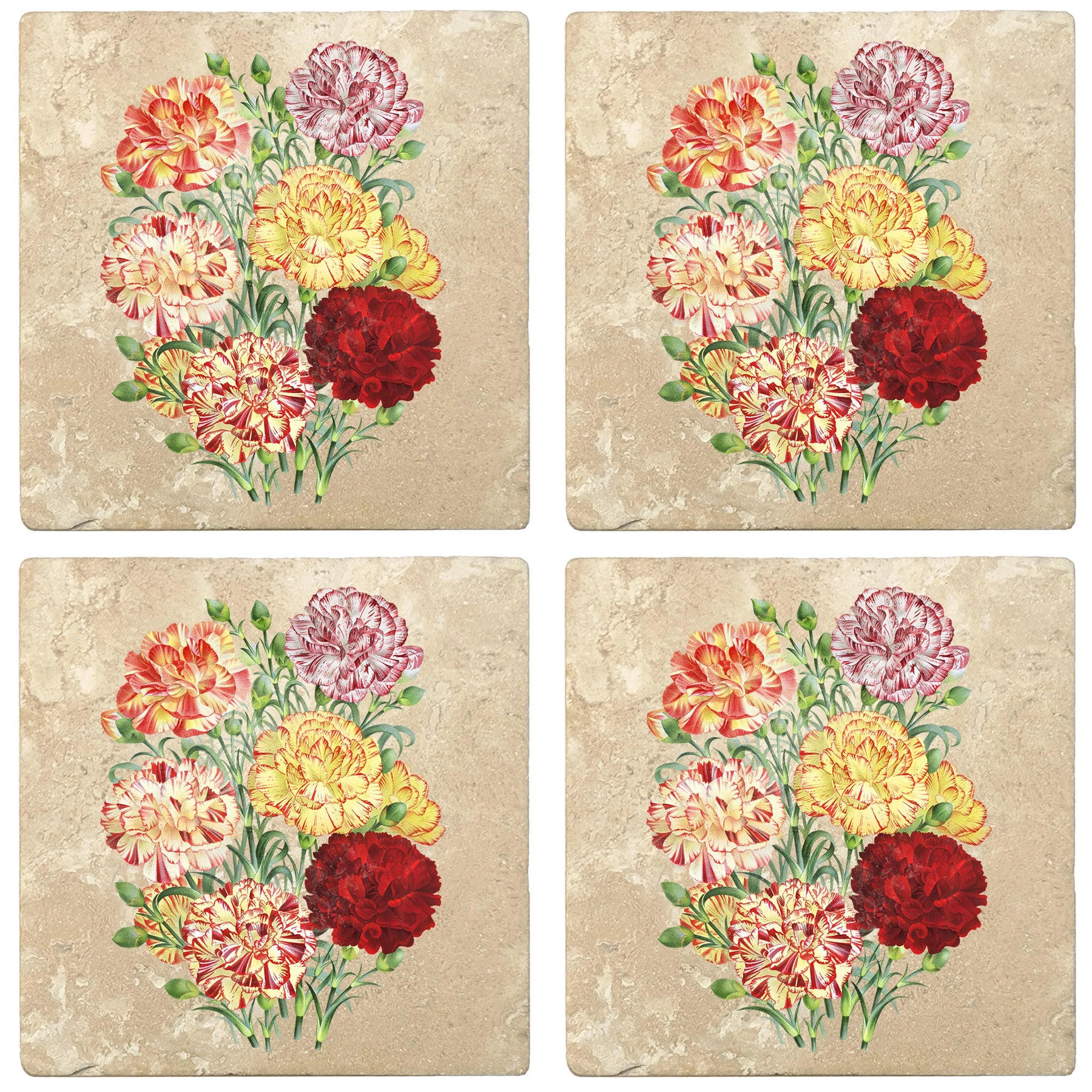 4" premium travertine absorbent stone flower designs drink coasters with cork backing, carnation flower bouquet. 2 sets of 4 pieces, 8 pieces total. Made in Mexico. Printed in the USA.