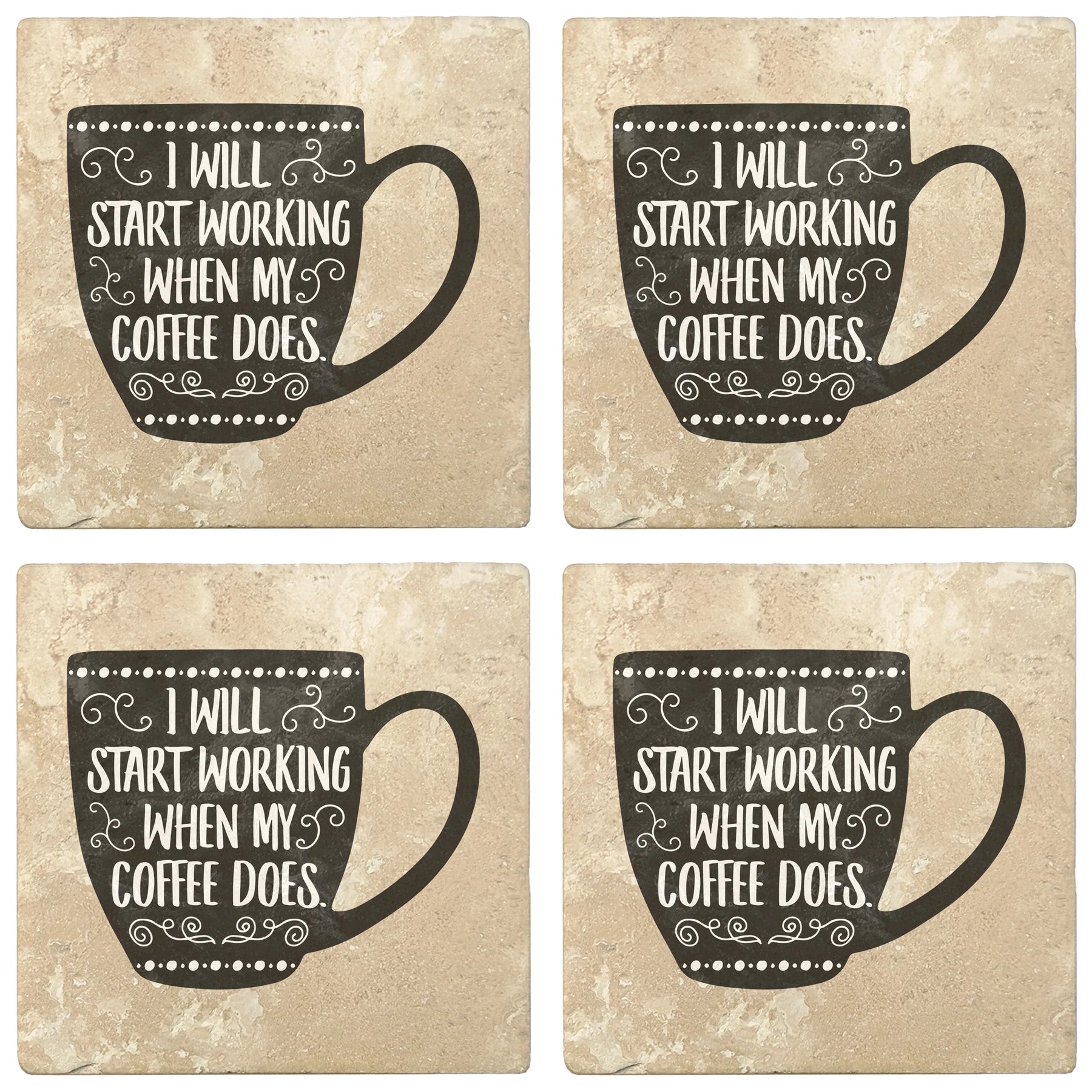 4" Absorbent Stone Coffee Gift Coasters, I Work When My Coffee Does, 2 Sets of 4, 8 Pieces