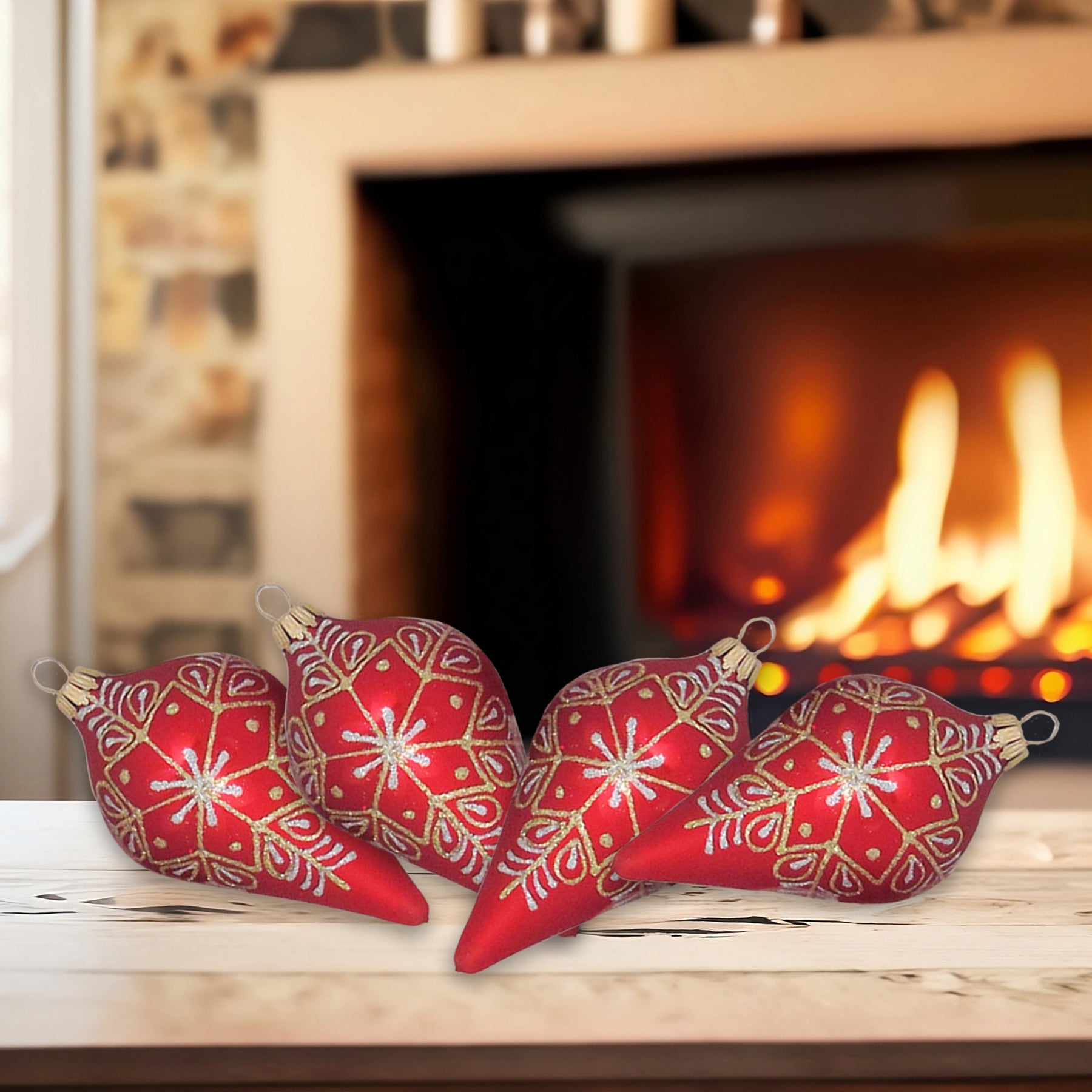 Glass Christmas Tree Ornaments - 67mm/2.63" [4 Pieces] Decorated Balls from Christmas by Krebs Seamless Hanging Holiday Decor (Red Velvet 4" Drops With Gold & Silver Snowflakes)